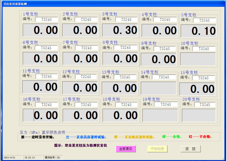 4、采用高級編程技術(shù)對采集的壓力數(shù)據(jù)進行處理,根據(jù)設(shè)定的參數(shù)自動判定支柱密封質(zhì)量是否合格,自動形成檢測報表并存貯。